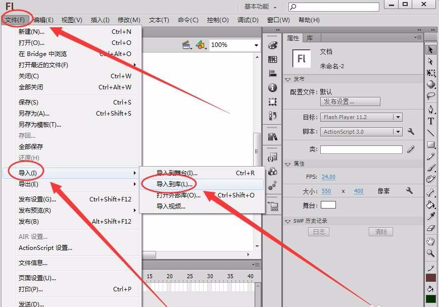 2、单击“文件”---->“导入”---->“导入到库”,在库中导入一张图片。