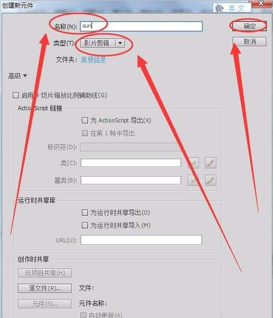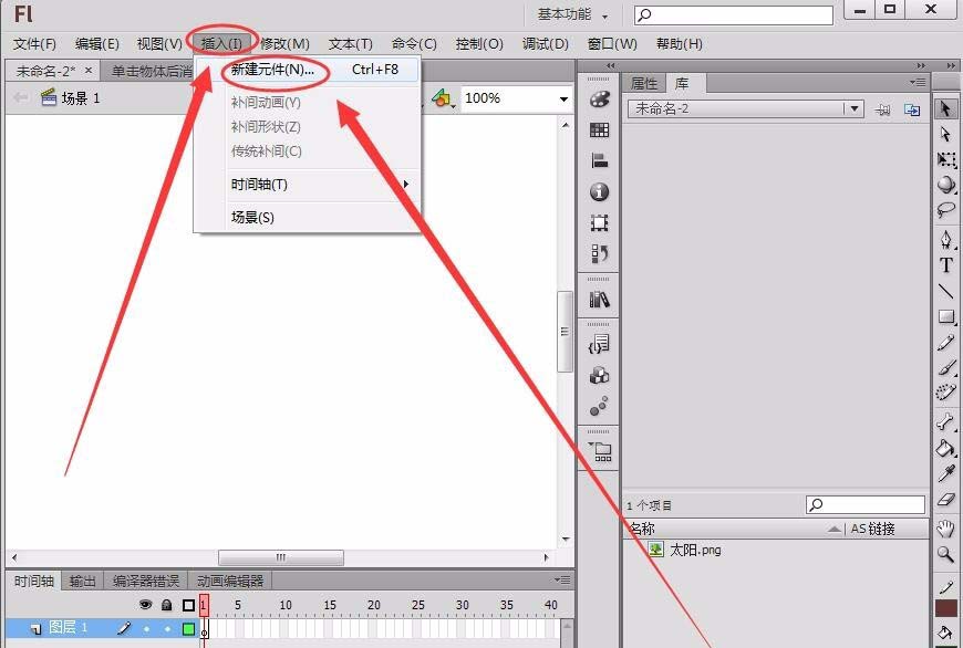 3、单击“插入”---->“新建元件”,将元件“名称”取名为“sun”,“类型”为影片剪辑,单击“确定”。