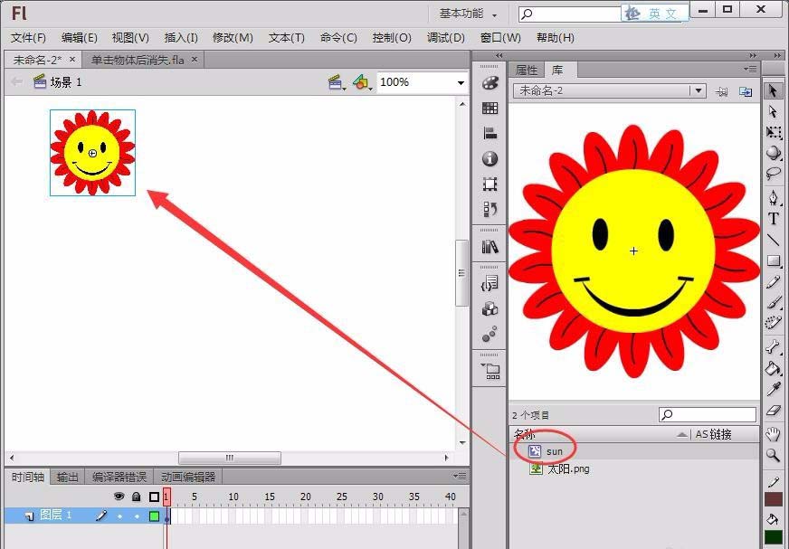 4、将“太阳”图片拖动到元件的舞台上。