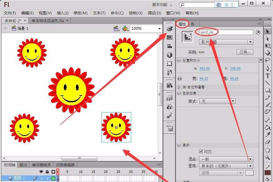6、用上一步同样的方法,在舞台再插入4个太阳元件,“实例名称”分别取名为“sun2_mc”、“sun3_mc”、“sun4_mc”和“sun5_mc”。