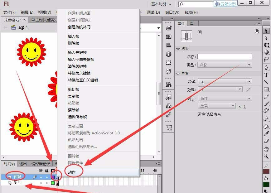 7、新建一个图层命名为“代码”,在图层的第1帧右击,选择“动作”选项。