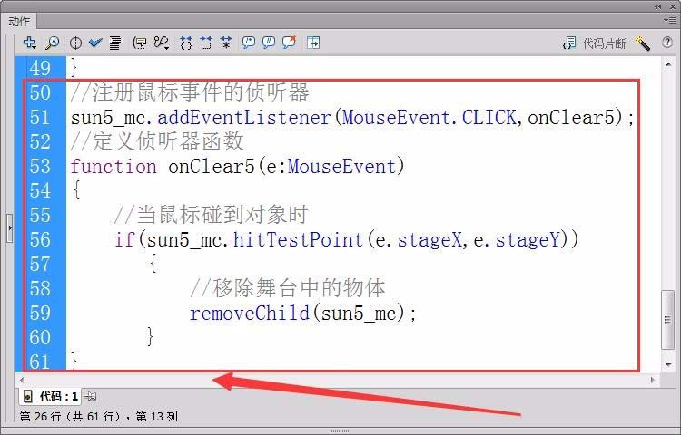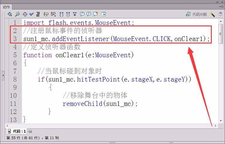 8、首先,定义元件“sun1_mc”的单击鼠标事件的侦听器,接收者函数为“onClear1”。