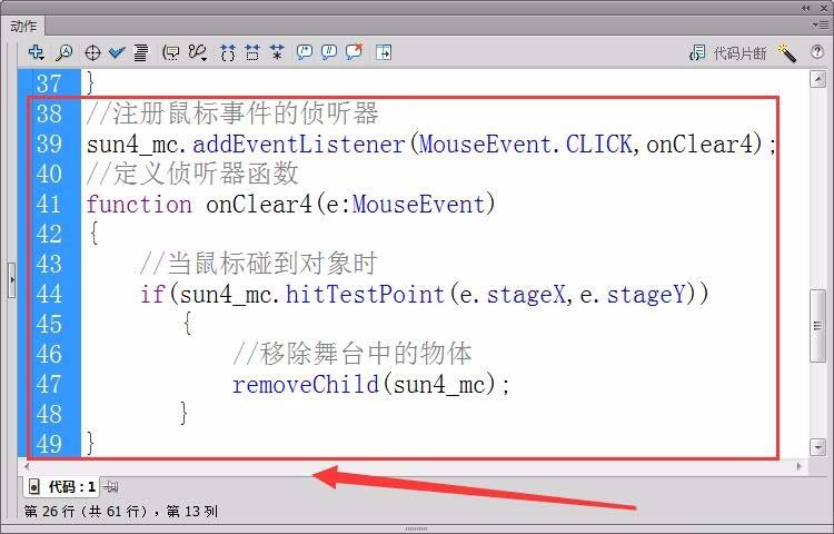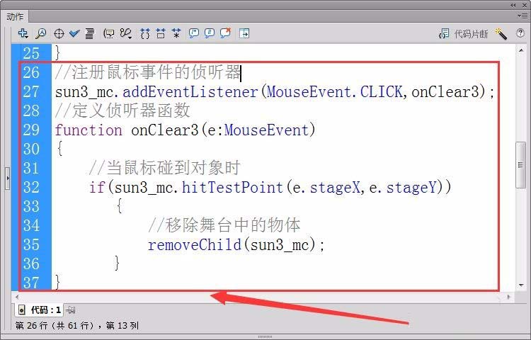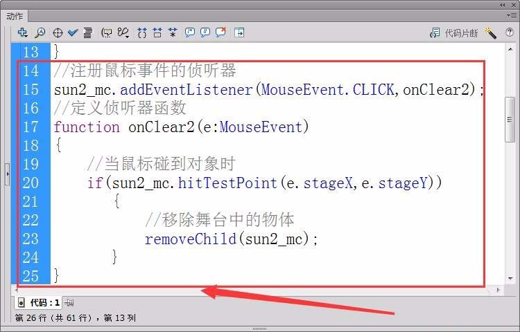 12、用8至11步同样的方法,编辑单击“sun2_mc”元件后,使其消失的代码。(注:侦听器函数改为onClear2)