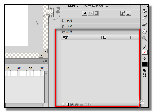 4、在舞台上,输入文字,比如:BD,现在,在界面右下方,滤镜属性这里是空的。