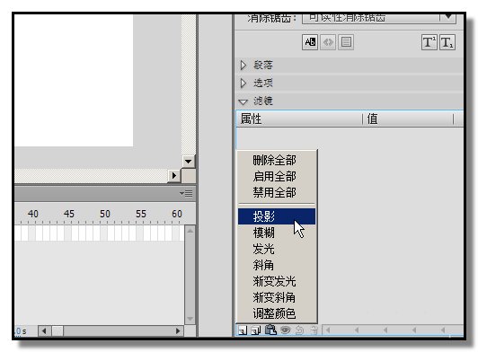 6、弹出的菜单中点:投影。这时,滤镜属性框内显示了“投影”相关设置选项。