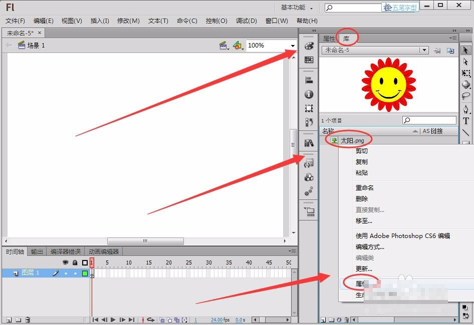 3、导入一张图片到库中,在“库”面板的图片上右击,选择“属性”。