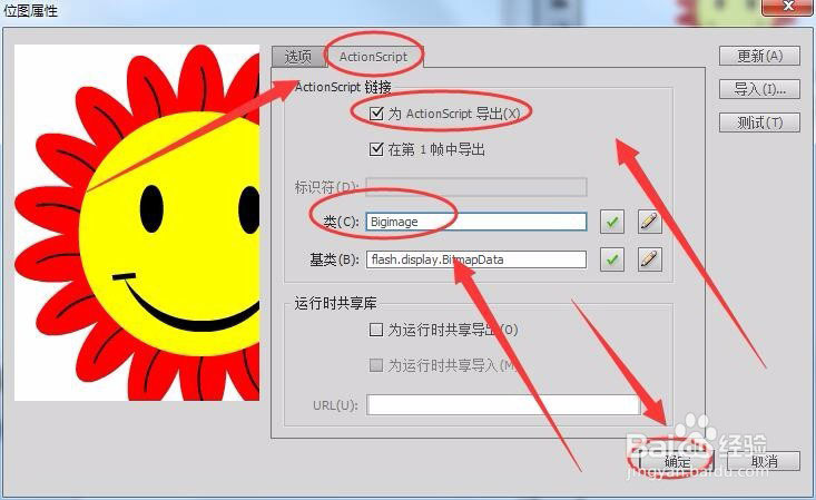 4、在“位图属性”窗口中,选择“ActionScript”选项卡,选中“为ActionScript导出”前面的勾,将“类”名更改为“Bigimage”,单击“确定”。