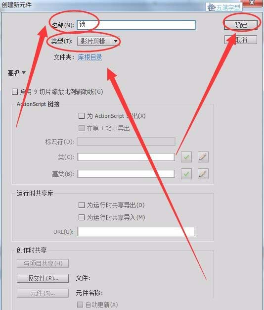 3、在“创建新元件”对话框中,将元件名称改为“锁”,类型选择“影片剪辑”,单击“确定”。