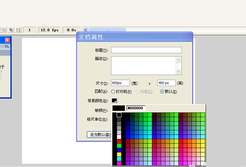 1、首先启动flash8,新建一文档,大小为600*400,帧频为12fps,背景颜色为黑色。