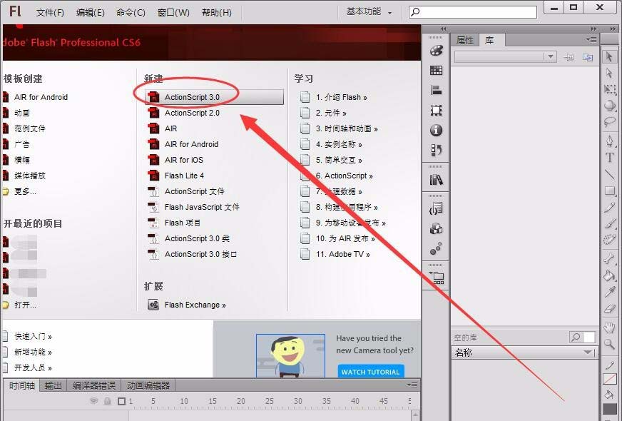 1、打开Flash软件,选择“ActionScript3.0”选项,新建一个空白文档。