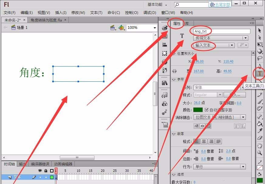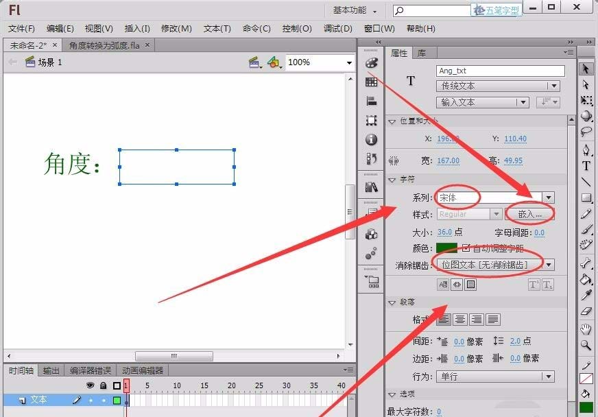 2、选择“编辑栏”中的“文本工具”,在舞台绘制一个“输入文本”框,将“实例名称”取名为“Ang_txt”。(注:要嵌入字体,输入文本内容才能在舞台正常显示)