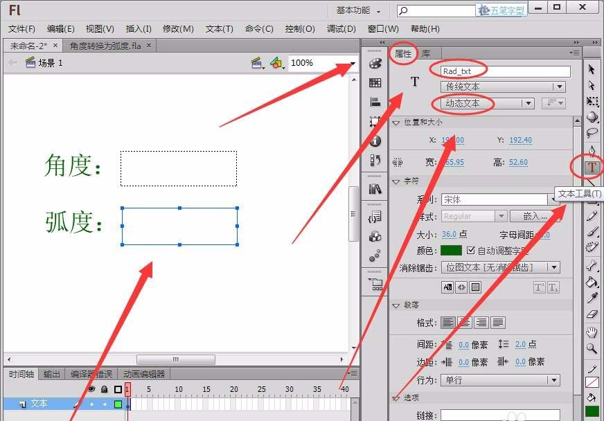 11、最后,在舞台的动态文本框中输出弧度值。