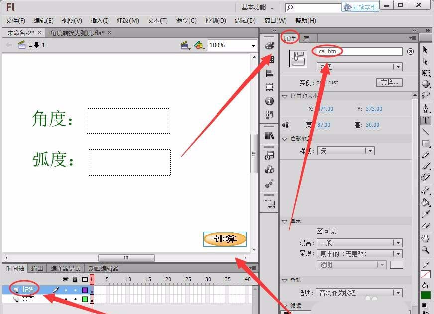 4、新建一个图层命名为“按钮”,插入一个按钮元件,将元件的“实例名称”取名为“cal_btn”。