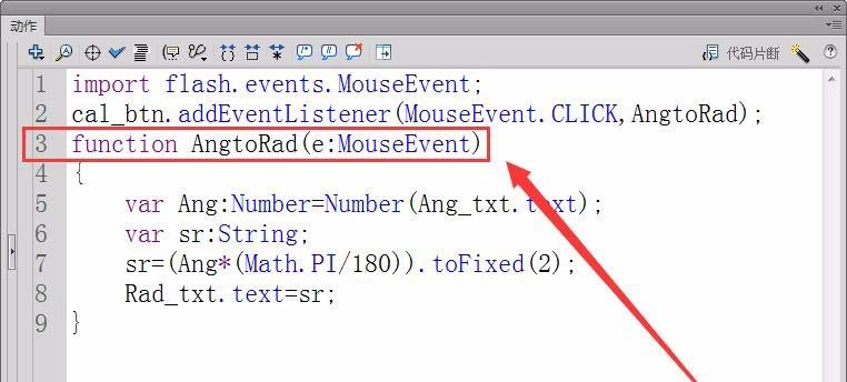 6、首先,注册按钮cal_btn的鼠标单击事件的侦听器,接收者函数为AngtoRad。