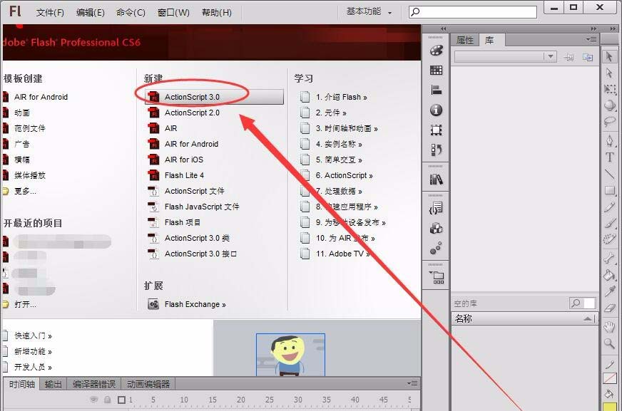 1、打开Flash软件,在出现的窗口中选择“ActionScript3.0”选项,新建一个空白文档。