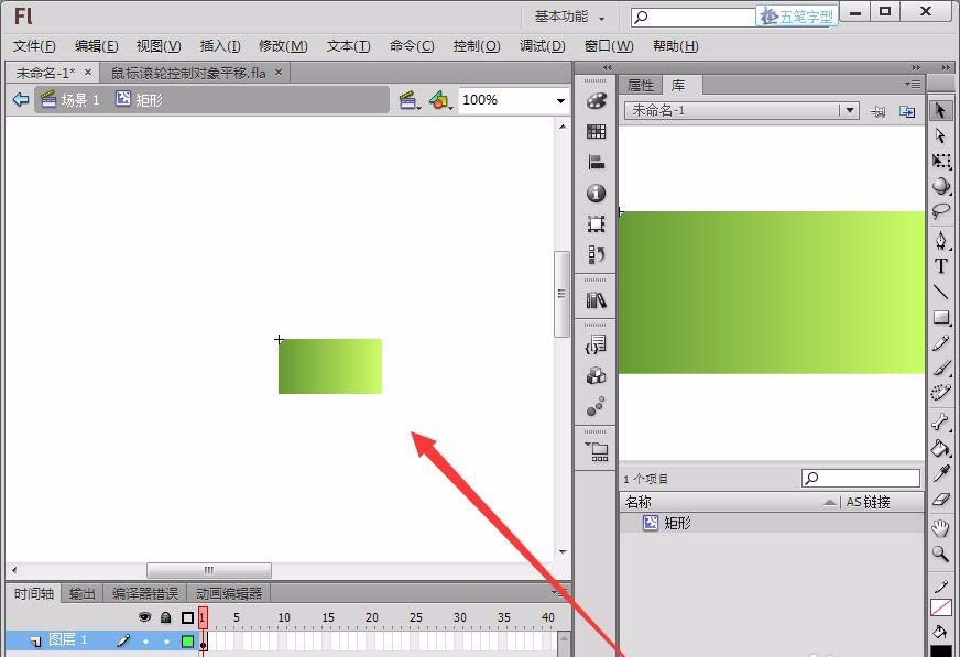 3、回到场景1,将库面板中的矩形元件拖动到舞台最左边,在“属性”面板中,将“实例名称”取名为“Rect_mc”。