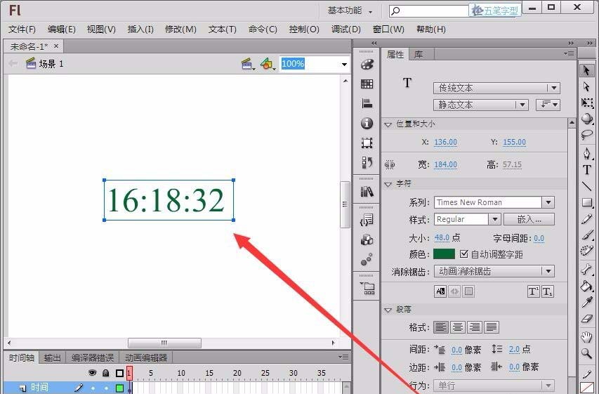 5、在舞台绘制一个静态文本框,并输入一个时间数字。