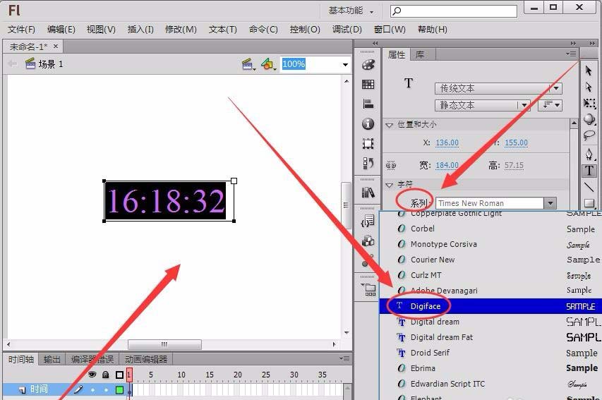 7、选择时间数字,在“属性”面板的“系列”中选择字体“Digiface”,该字体就是我们刚才安装的文件。