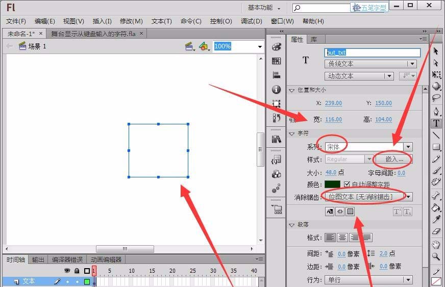 3、选择文本框,在“属性”面板中,将类型设置为“动态文本”,将“实例名称”取名为“out_txt”。(注:要在“属性”面板中要嵌入字体,运行程序后动态文本才能正常显示)