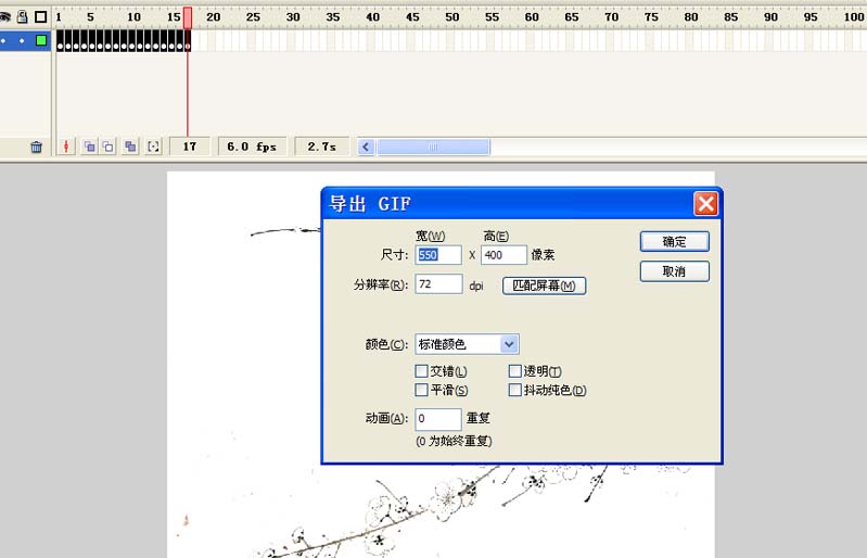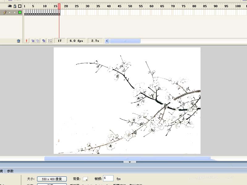 2、执行文件-导入-导入到舞台命令,将事先准备好的梅花图片导入,设置大小为550*400,设置全居中。
