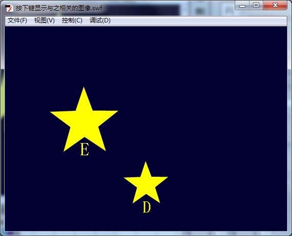 16、运行程序,当我们按下A、B、C、D、E中的任意一个键,舞台即显示与之相关的影片剪辑元件。