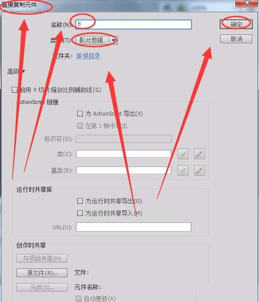 4、在出现的“直接复制元件”对话框中,“名称”取名为“B”,“类型”为影片剪辑,单击“确定”,制作一个影片剪辑元件B。