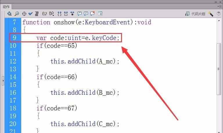 14、用if函数判断,如果按下的键值与字母A键的键值65一样,则将影片剪辑元件A_mc加入舞台的显示列表中,即让元件A显示。