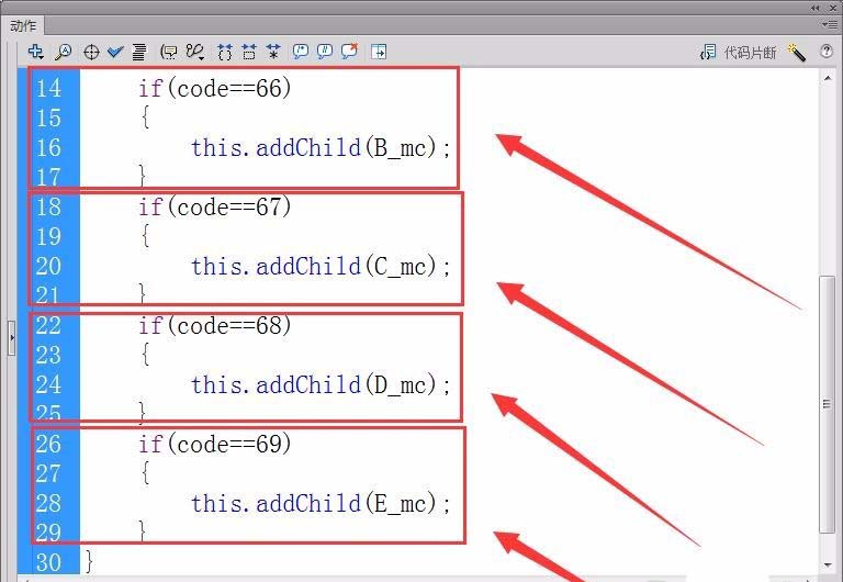 15、用上一步相同的方法,制作按下键盘上的B、C、D、E键后,分别显示影片剪辑元件B、C、D、E的代码。