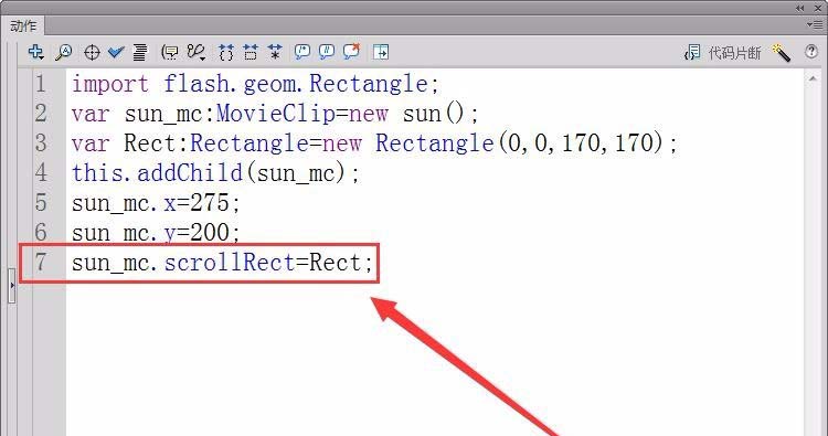 9、最后,设置滚动矩形区域,在舞台仅显示图像Rect的四分之一,用scrollRect属性实现操作。