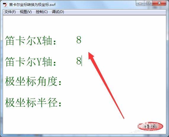 13、运行程序,输入笛卡尔坐标值后,单击“转换”按钮,就在舞台输出它的极坐标值。