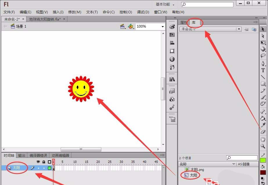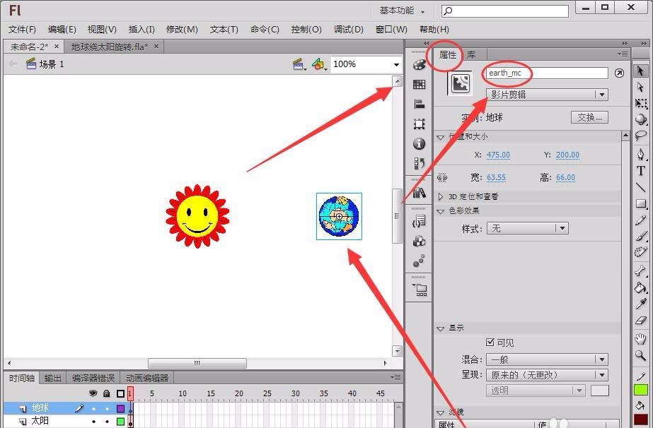 我们想要制作一个地球围绕太阳旋转的动画,只要点击舞台中的开始按钮就可以了,该怎么实现这个功能呢?下面我们就来看看详细的教程。