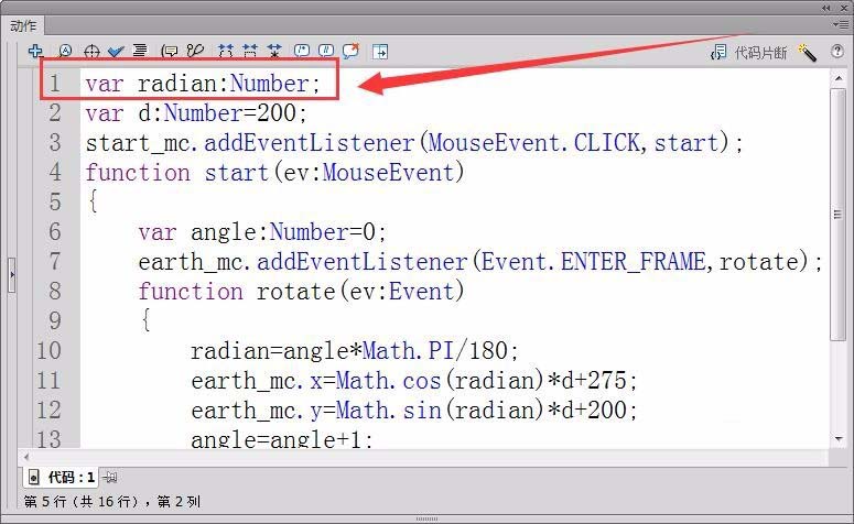 4、新建一个“代码”图层,打开动作面板。首先,定义浮点型变量radian,保存地球转过的角度的弧度值。