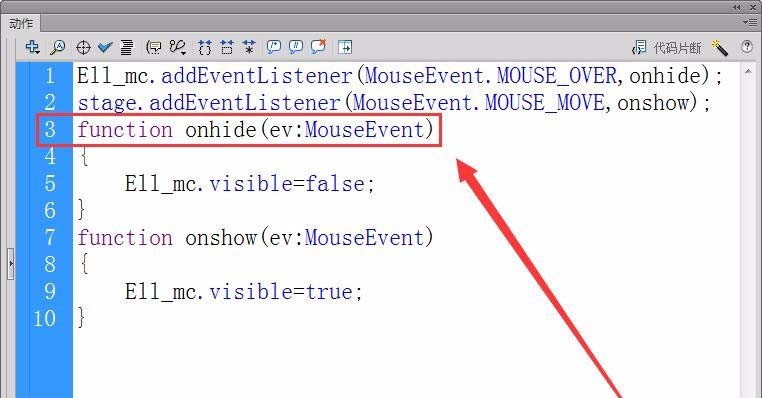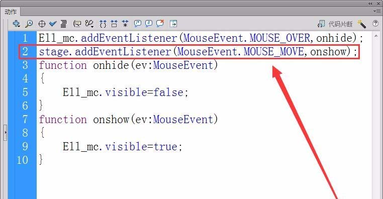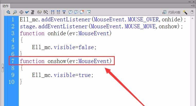 5、首先,注册对象Ell_mc鼠标移入事件的侦听器,接收者函数为onhide。