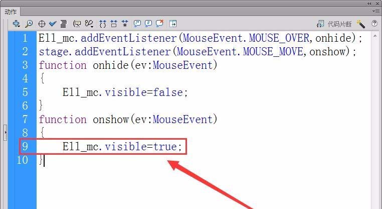 8、设置对象Ell_mc为不可见,用visible属性为false实现设置。