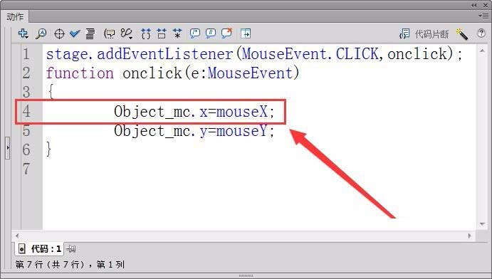 7、然后,将对象Object_mc的X轴坐标设置为点击鼠标所在的位置,用属性mouseX获取鼠标所在的X轴坐标。