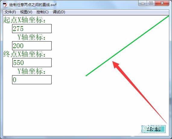 13、测试Flash程序,在舞台输入任意两点的坐标,单击“绘制”按钮,就自动绘制一条从起点到终点的直线。