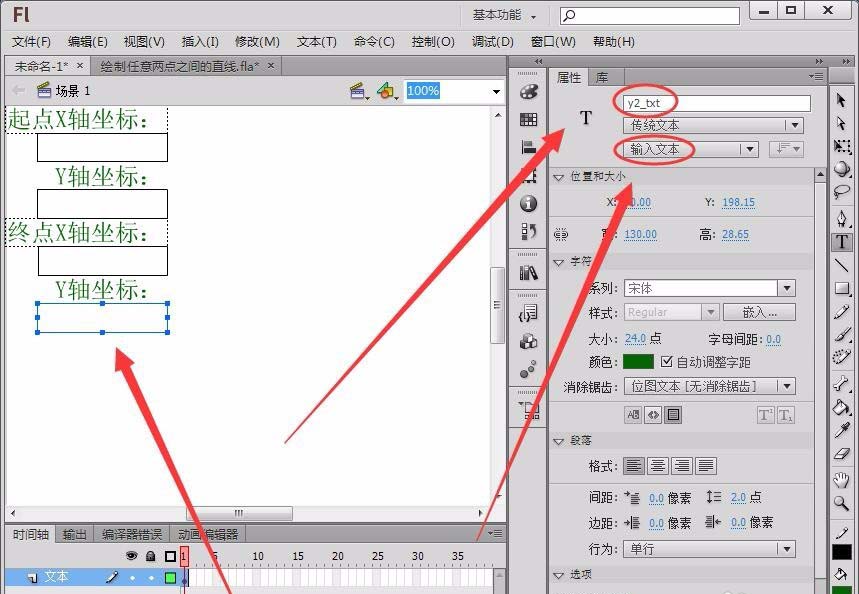 1、选择“编辑栏”中的“文本工具”,在舞台绘制4个输入文本框,在“属性”面板中将“实例名称”分别取名为“x1_txt”、“y1_txt“、”x2_txt“和”y2_txt“。(注:要嵌入字体)