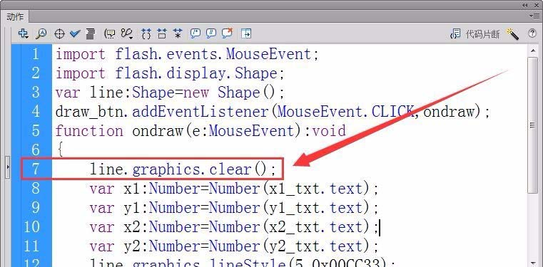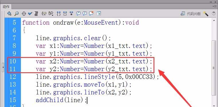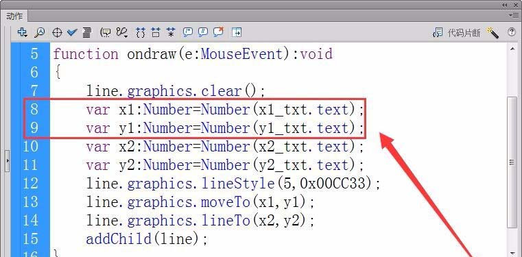7、接着,定义实型变量x1和y1,保存直线起点的X轴和Y轴坐标,用text属性从舞台获取坐标值。