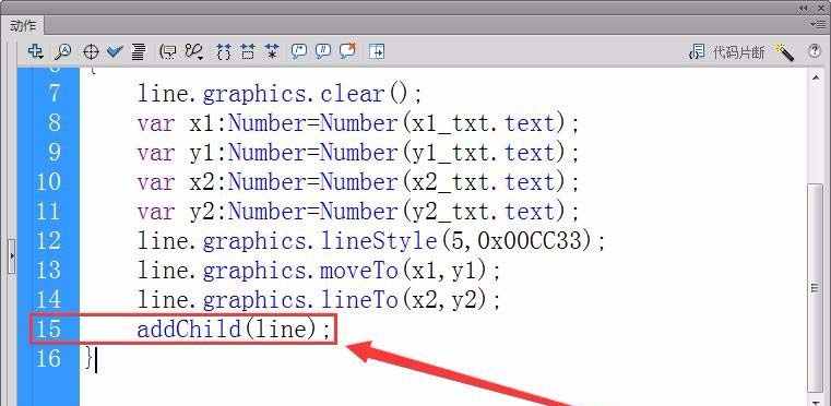 12、最后,将实例line添加到显示列表中,使直线能够在舞台正常显示。