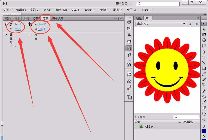 7、将“信息”面板的X和Y坐标设置为(275,200),图片就在舞台的中央了。但可以看到图像其实在中间偏下一点,这是因为对象以注册点作为坐标的位置,而该图像的注册点在图像的最左上方,注册点虽然在舞台中间了,但整个图像却没有在舞台中间,那该怎么办呢?