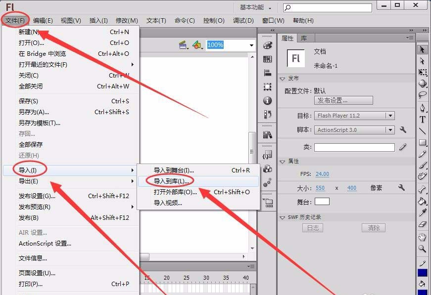 2、单击“文件”---->“导入”---->“导入到库”,选择一张图片导入到库中。