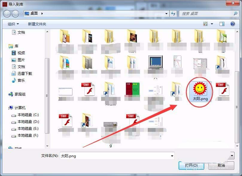 3、将“库”面板中的图片拖到舞台中,并调整为合适的大小,在舞台选中该图片对象。