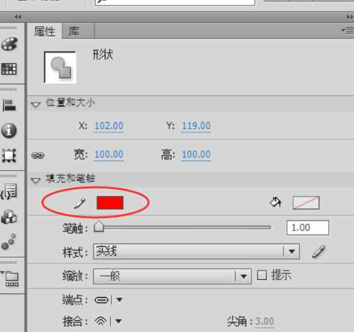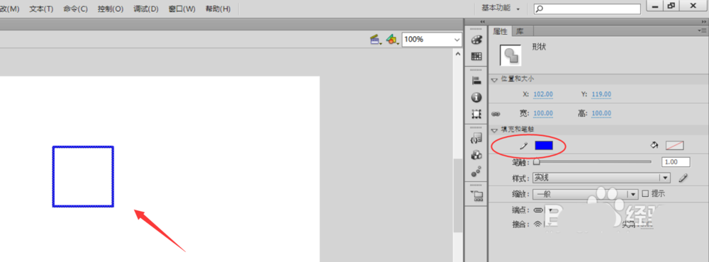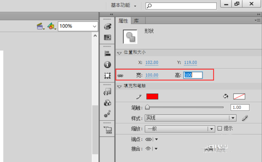 6、调整右侧属性面板,将宽、高均调整为100(根据自己需要修改)。这样,正方形就绘制好了