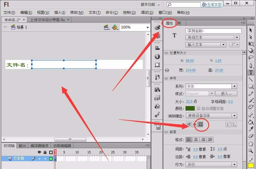 4、选择“文本工具”,在舞台中绘制一个静态文本框,内容为“文件名”。