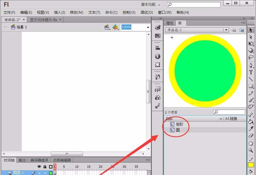 1、单击“插入”---->“新建元件”,在Flash库中新建两个元件“矩形”和“圆”。