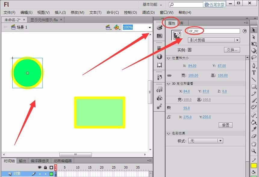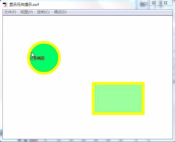 6、设置对象“cir_mc”和“rect_mc”的提示,分别为“这是椭圆”和“这是矩形”。