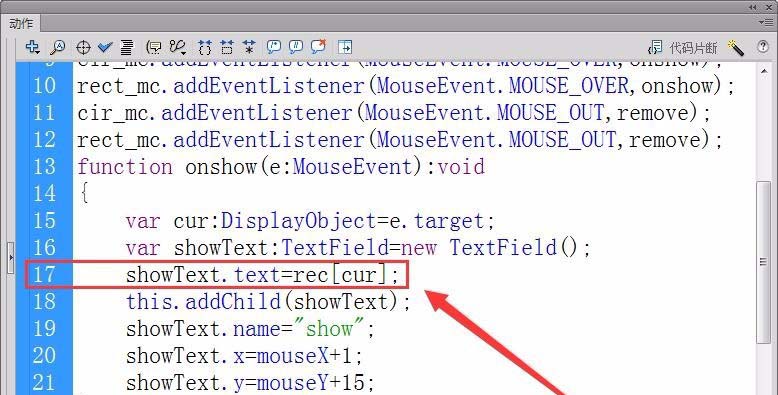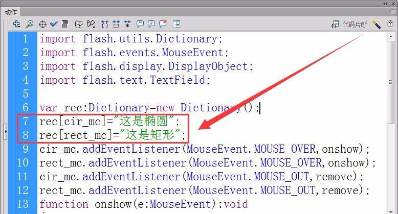 7、注册对象“cir_mc”和“rect_mc”的鼠标滑过事件的侦听器,接收者函数为“onshow”。