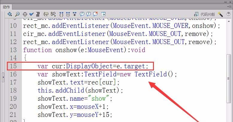 10、在函数中先定义显示对象cur,其指示的对象即为鼠标滑过的对象。