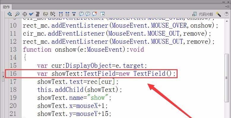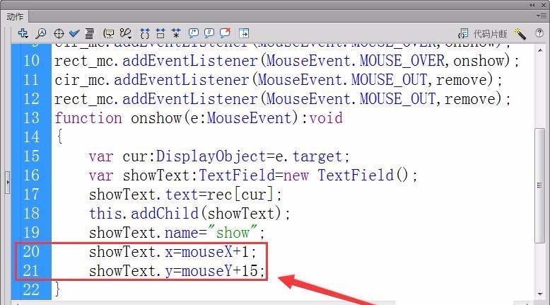 15、设置动态文本在舞台显示的坐标,根据鼠标的坐标获取。