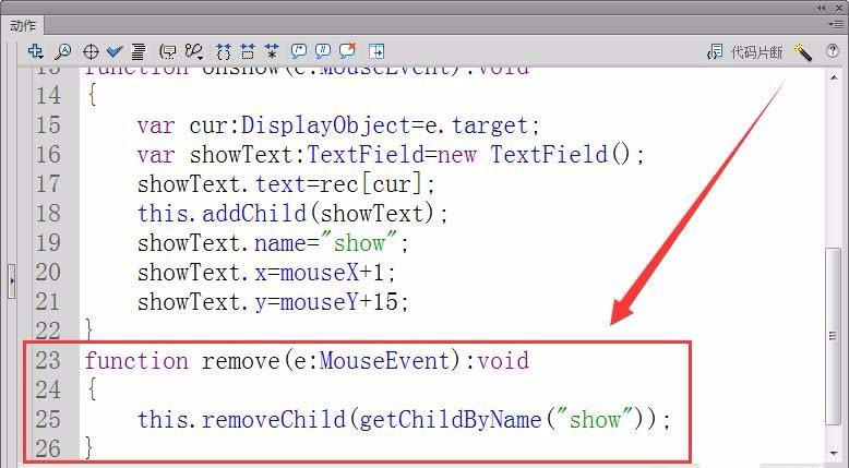 16、最后,定义函数remove,实现当鼠标移出对象后,将舞台上的提示移除。